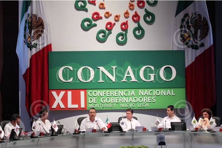 MONTERREY, NUEVO LEÓN, 27MAYO2011.- José Francisco Blake Mora, Secretario de Gobernación, y Rodrigo Medina, gobernador de la entidad nuevoleonesa, durante la XLl de la Conferencia Nacional de Gobernadores (CANAGO). FOTO: SEGOB/CUARTOSCURO.COM