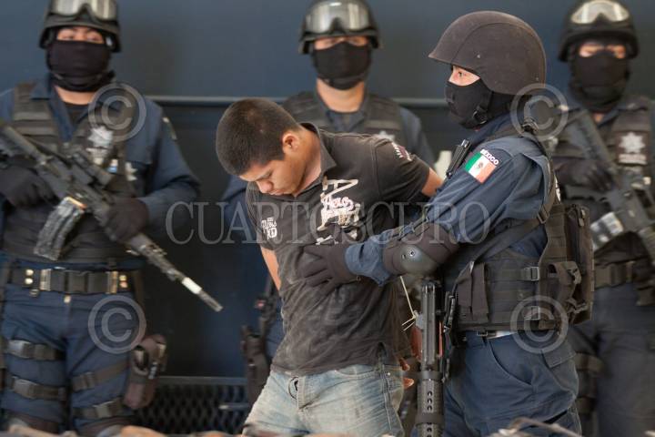 MÉXICO, D.F., 28MAYO2011.- Tras los enfrentamientos entre grupos criminales y fuerzas federales en Apatzingán, Michoacán, la Policía Federal aseguró a 36 presuntos integrantes de la organización criminal "La Familia", en el poblado de Las Lomas, municipio de Jilotlán, Jalisco. Esta acción fue el resultado del seguimiento a líneas de investigación tras la agresión a un helicóptero de la Policía Federal del pasado martes, luego de que se conoció que ayer se llevaría a cabo una reunión de comandos armados en los límites de Michoacán y Jalisco. En esta acción fueron detenidos tres presuntos jefes de grupo de la organización criminal, Gaudiyur Ambríz Altamirano, César Barragán Valencia y Gerardo Fernández Covarrubias; 11 presuntos delincuentes perdieron la vida y dos policías federales resultaron heridos. Fue asegurados un arsenal, cascos tácticos, chalecos balísticos, y más de 21 mil cartuchos útiles, así como rifles de alto poder. En la misma presentación se presentaron a 10 presuntos integrantes de la organización delictiva 'los zetas' y en este operativo se liberó a una persona durante un operativo en Quintana Roo. FOTO: MOISÉS PABLO/CUARTOSCURO.COM