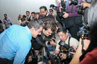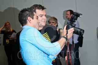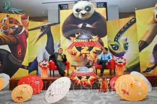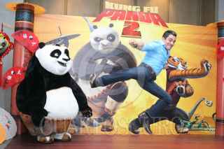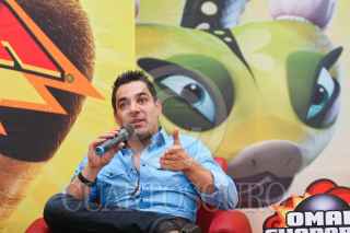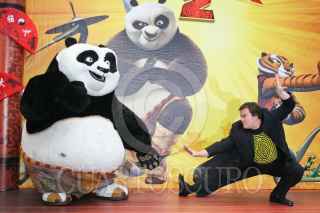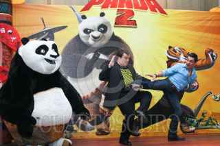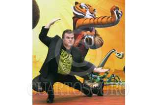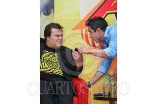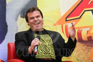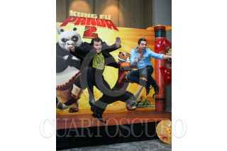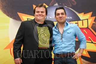 MÉXICO, D.F., 28MAYO2011.- Los actores Jack Black y Omar Chaparro, quienes dan voz en inglés y español al oso Po, durante la conferencia de la película Kung Fu Panda 2. FOTO: ISAAC ESQUIVEL/CUARTOSCURO.COM