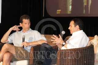 PUNTA MITA, NAYARIT, 28MAYO2011.- Ernesto Cordero Arroyo, el Secretario de Hacienda, y Jon Rubinstein, inventor del iPod, dialogan durante el foro Emprende tu México, donde se destacó la innovación como camino al desarrollo. FOTO: ESPECIAL/CUARTOSCURO.COM