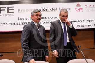 MÉXICO, D.F., 30MAYO2011.- Leonardo Valdés Zurita, Consejero presidente del Instituto Federal Electoral (IFE), acudió a la presentación del libro ¨Los superhéroes no existen; los migrantes mexicanos ante las primeras elecciones en el exterior" de Leticia Calderón Chelius. Aquí Leonardo Valdés y el consejero Benito Nacif. FOTO: IVÁN STEPHENS/CUARTOSCURO.COM