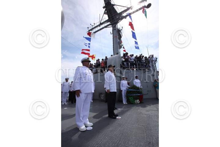 MUNICIPIO DE GUAYMAS, SONORA, 01JUNIO2011.- Felipe Calderón Hinojosa, presidente de México, durante la ceremonia de abanderamiento de los buques de señalización maritima "Virgo y Sagitario", que se llevo a cabo en el muelle del centro internacional de cruceros. FOTO: ALDREDO GUERRERO/CUARTOSCURO.COM