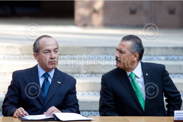 MÉXICO, D.F., 03JUNIO2011.- Felipe Calderón Hinojosa, Presidente de los Estados Unidos Mexicanos, y Manlio Fabio Beltrones, presidente de la mesa directiva del Senado de la República, encabezaron la ceremonia de promulgación de la Reforma Constitucional en materia de amparo, en las escalinatas de la residencia oficial de Los Pinos. FOTO: MOISÉS PABLO/CUARTOSCURO.COM