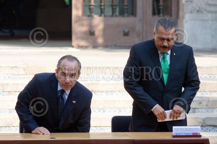 MÉXICO, D.F., 03JUNIO2011.- Felipe Calderón Hinojosa, Presidente de los Estados Unidos Mexicanos, y Manlio Fabio Beltrones, presidente de la mesa directiva del Senado de la República, encabezaron la ceremonia de promulgación de la Reforma Constitucional en materia de amparo, en las escalinatas de la residencia oficial de Los Pinos. FOTO: MOISÉS PABLO/CUARTOSCURO.COM