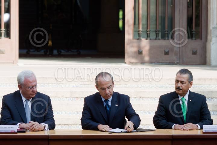 MÉXICO, D.F., 03JUNIO2011.- Felipe Calderón Hinojosa, Presidente de los Estados Unidos Mexicanos, y Manlio Fabio Beltrones, presidente de la mesa directiva del Senado de la República, encabezaron la ceremonia de promulgación de la Reforma Constitucional en materia de amparo, en las escalinatas de la residencia oficial de Los Pinos. FOTO: MOISÉS PABLO/CUARTOSCURO.COM