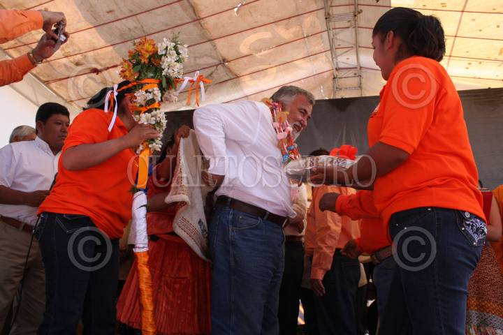 SAN JOSÉ DEL RINCÓN, ESTADO DE MÉXICO, 04JUNIO2011.- Alejandro Encinas Rodriguez, candidato a la gubernatura del Estado de México por la coalición "Unidos Podemos Más" (PRD, PT, Convergencia) realizó un evento masivo en el municipio de San José del Rincón, donde lo recibieron con un ritual mazahua y le otorgaron el bastón de mando, entre otros obsequios. FOTO: ADRIANA ALVAREZ/CUARTOSCURO.COM