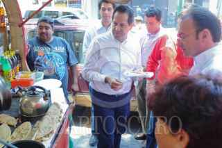 TOLUCA, ESTADO DE MÉXICO, 04JUNIO2011.- Antes de partir al municipio de Chapultepec a apradrinar a 120 quinceañeras, Eruviel Ávila, candidato a gobernador del Estado de México por la Coalición Unidos por Ti, almorzó unas quesadillas en el puesto de “Doña Ofe” en la tradicional Alameda de Toluca. Le acompañó Luis Videgaray, presidente del PRI en la entidad. FOTO: CUARTOSCURO.COM