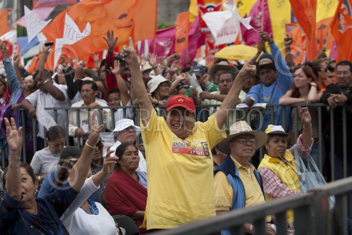 MÉXICO, D.F., 05JUNIO2011.- Andrés Manuel López Obrador, excandidato a la presidencia de la Republica, y dirigente del Movimiento Regeneración Nacional (MORENA) y Alejandro Encinas Rodríguez, candidato de la coalición “Unidos Podemos Mas” por la gobernatura del Estado de México, durante el mitin realizado este medio día en la plancha del Zócalo, donde el excadidato aseguró que en el Estado de México se vive el primer episodio de la historia que tendrá su momento definitorio en los comicios presidenciales de 2012. FOTO: GUILLERMO PEREA/CUARTOSCURO.COM