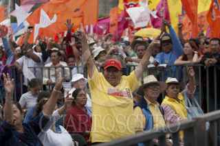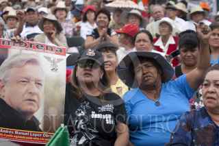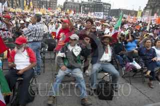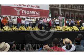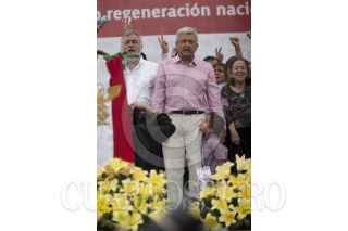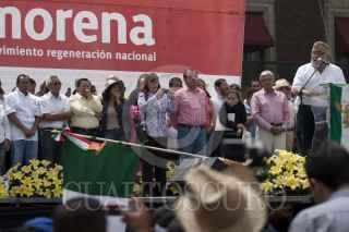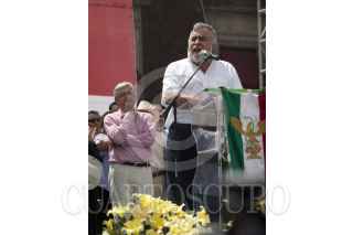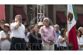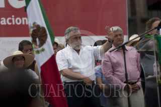 MÉXICO, D.F., 05JUNIO2011.- Andrés Manuel López Obrador, excandidato a la presidencia de la Republica, y dirigente del Movimiento Regeneración Nacional (MORENA) y Alejandro Encinas Rodríguez, candidato de la coalición “Unidos Podemos Mas” por la gobernatura del Estado de México, durante el mitin realizado este medio día en la plancha del Zócalo, donde el excadidato aseguró que en el Estado de México se vive el primer episodio de la historia que tendrá su momento definitorio en los comicios presidenciales de 2012. FOTO: GUILLERMO PEREA/CUARTOSCURO.COM