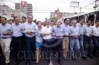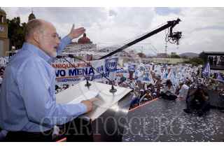 TLANEPANTLA, ESTADO DE MÉXICO,. 05JUNIO2011.- Luis Felipe Bravo Mena, candidato del PAN a la gubernatura del estado de México, realizó un mitin como relanzamiento de su campaña electoral en la que fue acompañado de Ernesto Cordero Arroyo, Secretario de Hacienda, Javier Lozano Alarcón, Secretario del Trabajo y Previsión Social, Santiago Creel Miranda, Senador del PAN; Josefina Vázquez Mota, coordinadora de la bancada del blanquiazul en San Lázaro; Juan Rafael Elvira Quesada, Secretario del Medio Ambiente y Recursos Naturales, Marco Adame, Gobernador de Morelos y Alonso Lujambio, titular de la SEP, entre otros el mitin fue realizado en la explanada municipal de Tlalnepantla. FOTO: RODOLFO VALTIERRA/CUARTOSCURO.COM