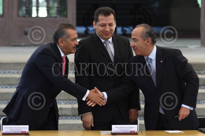 MÉXICO, D.F., 09JUNIO2011.- Raul Plascencia Villanueva, presidente de la Comisión Nacional de Derechos Humanos; Manlio Fabio Beltrones Rivera, presidente de la mesa directiva del Senado de la República y Juan Silva Meza, presidente de la Suprema Corte de Justicia de la Nación durante el evento de la Promulgación de la Reforma Constitucional en Materia de Derechos Humanos que se realizo en la escalinata de la residencia oficial de Los Pinos. FOTO: RODOLFO ANGULO/CUARTOSCURO.COM