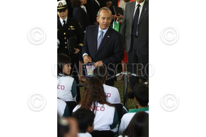 MÉXICO, D.F., 09JUNIO2011.- El presidente Felipe Calderón acompañado de su esposa Margarita Zavala, Justino Compean, presidente de la Federación Mexicana de Fútbol y Bernardo de la Garza, titular de la Conade al termino del evento del abanderamiento de las Selecciones Nacional de Fútbol Sub 17, Femenil Mayor y de Playa que se realizo en la residencia oficial de Los Pinos. FOTO: RODOLFO ANGULO/CUARTOSCURO.COM