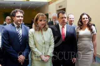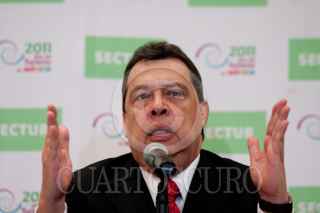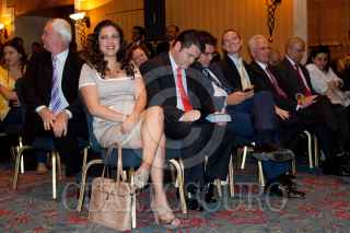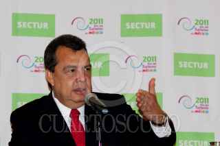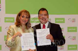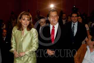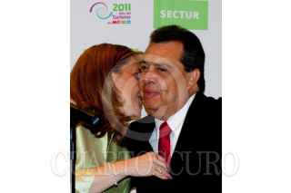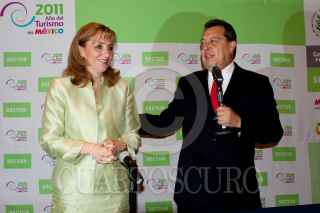 MÉXICO, D.F., 09JUNIO2011.- El gobernador de Guerrero Ángel Guerrero Rivero le canto "Acuedate de Acapulco" a la secretaria de Turismo Gloria Guevara Manzo, en alusión a el reciente cambio de sede de el Tianguis Turístico el cual era albergado en el puerto de Acapulco, esto tras finalizar el anunció por una inversión de 240 millones de pesos en proyectos turísticos en la entidad. FOTO: MOISÉS PABLO/CUARTOSCURO.COM