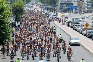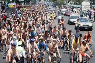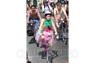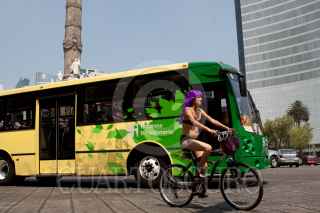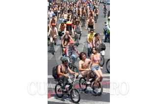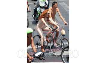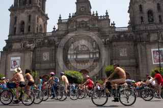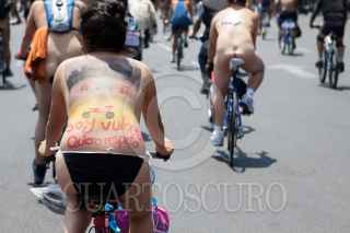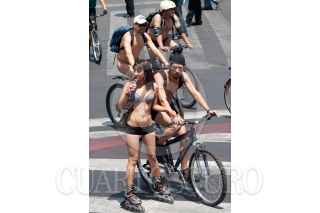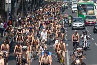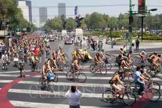 MÉXICO, D.F., 11JUNIO2011.- Decenas de ciclistas se desnudaron para recorrer avenida Reforma con dirección a Plaza de Río de Janeiro en la colonia Roma, para exigir respeto por parte de los conductores de vehículos. Con consignas como “usa la bici” y “cambia de ruedas”, los participantes World Naked Bike Ride México, marcharon por las calles de la ciudad. FOTO: MOISÉS PABLO/CUARTOSCURO.COM