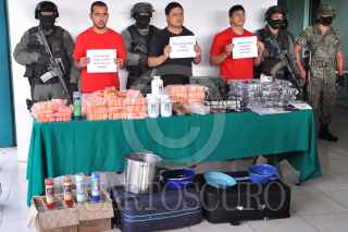 VILLAHERMOSA, TABASCO, 14JUNIO2011.- La procuraduria general de justicia local presento a tres presuntos integrantes de la célula delictiva "Zeta" en las instalaciones de la Policía Ministerial. Así mismo aseguraron instrumentos con los que se procesan la drogas; los hoy detenidos fueron capturados en pasados días en el interior del hotel Luna Azul de esta ciudad capital. FOTO: MARCO POLO GUZMAN HERNANDEZ/CUARTOSCURO.COM