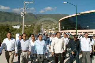 Chilpancingo, Guerrero, 14SEPTIEMBRE2004.- Heriberto Huicochea Vazquez, secretario de desarrollo social, Luis León Aponte, secretario general de gobierno, Raúl Calvo Sanchez, presidente del Tribunal Superior de Justicia, Saúl Alarcon Abarca, alcalde, Rene Juarez Cisneros, gobernador del estado, Gilberto Toledano, comandante de la 35 zona militar y Juan Farril Herrera, secretario de desarrollo urbano, durante el recorrido por las instalaciones del nuevo palacio de gobierno el cual se ubica en la ciudad de los servicios al sur de Chilpancingo. Foto: Oscar Alvarado/CUARTOSCURO.COM