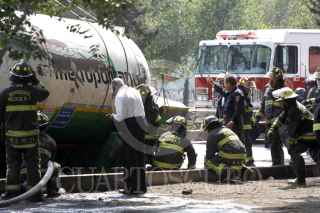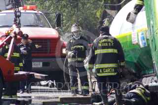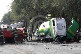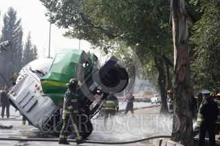 MÉXICO, D.F., 16JUNIO2011.- Una pipa que transportaba Gas L.P. volcó al perder el control tras impactarse con una unidad de servicio público en el cruce de calzada Ignacio Zaragoza a la altura de la calle Ixtaccihuatl en la colonia Moctezuma, de la Delegación Venustiano Carranza. En el lugar, laboraron por más de 2 horas elementos de Bomberos y personal de Protección Civil de esta Delegación. FOTO: LUIS CARBAYO/CUARTOSCURO.COM