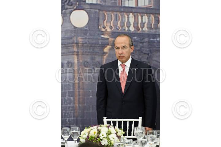 MÉXICO, D.F., 20JUNIO2011.- Felipe Calderón Hinojosa, presidente de México, entregó la condecoración de la "Orden Mexicana del Águila Azteca", en grado de collar, a Mauricio Funes, presidente de El Salvador durante un almuerzo de estado en honor al mandatario salvadoreño quien realiza una visita de estado a México. Ésto se realizó en el Alcazar del Castillo de Chapultepec. FOTO: MISAEL VALTIERRA/CUARTOSCURO.COM