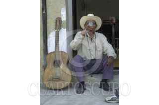 MONTERREY, NUEVO LEON 16SEPTIEMBRE2004.- Después de recorrer la ciudad por parques y jardines, ofreciendo sus canciones a 5 pesos Don Juan Treviño Cantú, se toma un descanso y un refresco, frente a la Macroplaza. FOTO: Antonio Ruvalcaba/CUARTOSCURO.COM
