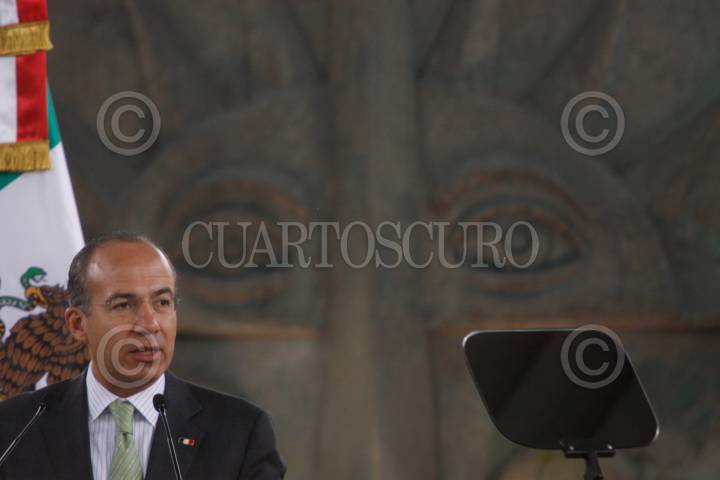 MÉXICO, D.F. 21JUNIO2011.- Felipe Calderón Hinojosa, presidente de México, durante el lanzamiento del programa Mundo Maya 2012 ralizado en el Museo Nacional del Antropología e Historia. FOTO: IVAN STEPHENS/CUARTOSCURO.COM