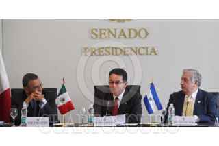 MÉXICO, D.F. 21JUNIO2011.- Mauricio Funes Cartagena, presidente de El Salvador acompañado del senador Agustín Arroyo y el senador Arturo Nuñez durante una reunión con legisladores que se realizo en el Senado de la República. FOTO: RODOLFO ANGULO/CUARTOSCURO.COM