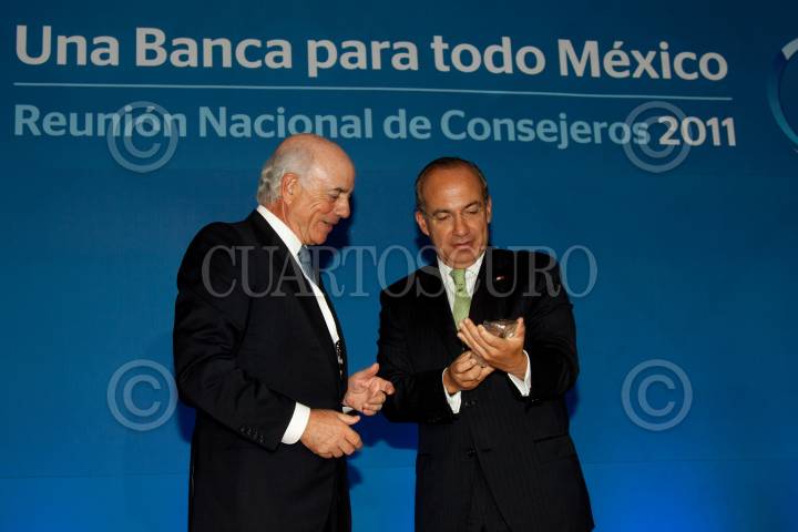 MÉXICO, D.F., 21JUNIO2011.- Felipe Calderón Hinojosa, Presidente de los Estado Unidos Mexicanos, saluda a Francisco Gil Díaz, ex-secretario de Hacienda, al finalizar la comida anual de consejeros regionales de BBVA-Bancomer. FOTO: MOISÉS PABLO/CUARTOSCURO.COM