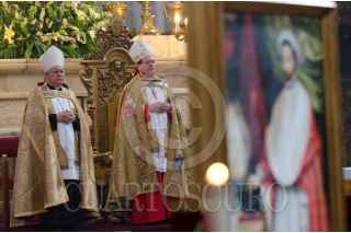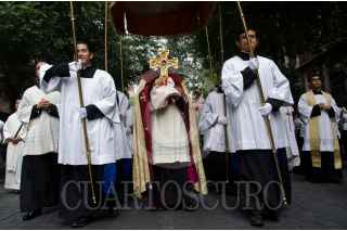 MÉXICO, D.F., 22JUNIO2011.- En una procesión solemne que partió de la parroquia de la Santa Vera Cruz, más de un centenar de católicos acompañaron al obispo auxiliar de la Ciudad de México, monseñor Antonio Ortega, y a los guardias (ataviados con la vestimenta del siglo XVII) por las calles del Centro Histórico para arribar a la Catedral Metropolitana, donde el cardenal Norberto Rivera Carrera recibió las reliquias del beato Juan de Palafox y Mendoza y las postró en el altar mayor para su devoción. FOTO: MISAEL VALTIERRA/CUARTOSCURO.COM
