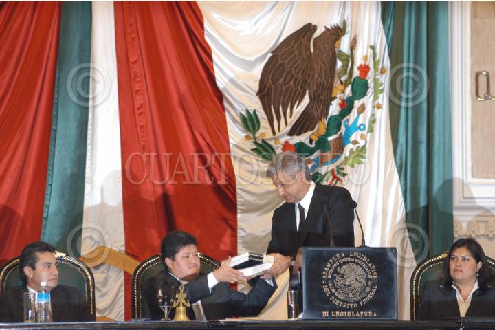 MEXICO, DF 17SEPTIEMBRE2004.- Andrés Manuel López Obrador, jefe de gobierno de la ciuad de México hace una pausa para tomar un vaso de agua durante la lectura de su cuarto informe de gobierno. FOTO: Germán Romero/CUARTOSCURO.COM