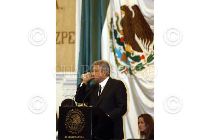 MEXICO, DF 17SEPTIEMBRE2004.- Andrés Manuel López Obrador, jefe de gobierno de la ciuad de México hace una pausa para tomar un vaso de agua durante la lectura de su cuarto informe de gobierno. FOTO: Germán Romero/CUARTOSCURO.COM
