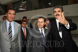 PUEBLA, PUEBLA, 23JUNIO2011.- Rafael Moreno Valle Rosas, gobernador de Puebla, junto al titular de la SHCP, Luis Ernesto Cordero y el presidente del consejo consultivo de la CIRT, Rafael Borbón Ramos, posan con el reconocimiento que le otorgaron al secretario de hacienda durante su ponencia en la 79 convención nacional de la CIRT en Puebla. FOTO: FRANCISCO GUASCO/CUARTOSCURO.COM