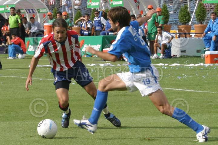 MEXICO, D. F. 18SEPTIEMBRE2004.- Marco Garcés del Cruz Azul y Ramón Morales se disputan un balón durante su encuentro en el estadio Azul, el marcador final 4-2 en favor de la chivas. FOTO: Nelly Salas/CUARTOSCURO.COM