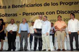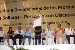ACAPULCO, GUERRERO, 27JUNIO2011.- Marcelo Ebrard Casaubon, jefe de gobierno del D.F., y Ángel Aguirre Rivero, gobernador de Guerrero, hicieron la primer entrega de tarjetas a beneficiarios de los programas “Guerrero Cumple”, que se otorgaron a cuatro mil madres jefas de familia y 500 personas con discapacidad. FOTO: CUARTOSCURO.COM