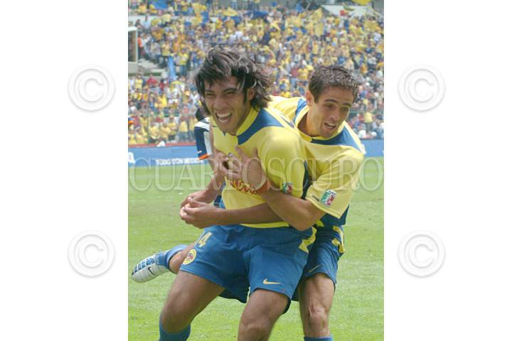 MEXICO, D.F. 19SEPTIEMBRE2004.- Mario Pérez (América) festeja el gol con José Antonio Castro en el partido de la jornada 6 del Torneo de Apertura 2004 en el que las Águilas del América vencieron un gol a cero a los Rayados del Monterrey. FOTO: Iván Stephens/CUARTOSCURO.COM