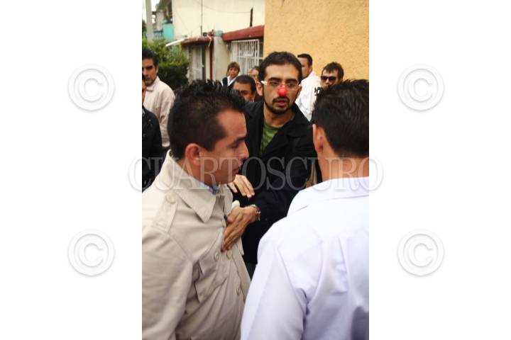ECATEPEC, ESTADO DE MÉXICO, 03JULIO2011.- Integrantes de la organización civil “Democracia Real Ya” se manifestaron con pancartas y narices de payaso a la salida de la casilla donde el candidato a la coalición “Unidos Por Ti” del PRI, PVEM y PANAL a la gubernatura del Estado de México emitió su voto electoral. Algunas personas vestidos de civil intentaron quitarles las mantas. FOTO: SAÚL LÓPEZ/CUARTOSCURO.COM