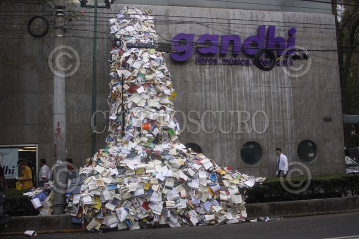 MÉXICO, D.F., 05JULIO2011.- Frente a la librería Gandhi de Miguel Ángel de Quevedo fue montada una escultura de la artísta plástica Alicia Martín con libros descatalogados, defectuosos y maltratados donados por varias editoriales que al finalizar la obra será reciclados. FOTO: IVAN STEPHENS/CUARTOSCURO.COM