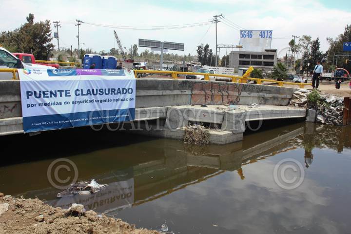 ECATEPEC, ESTADO DE MÉXICO., 06JULIO2011.- La Comisión Nacional del Agua clausuró y notificó a las autoridades estatales a demoler el puente ubicado sobre el río Los Remedios y Circuito Exterior Mexiquense, en el límite de Nezahualcóyotl y Ecatepec, debido a los hundimientos ocasionados a los costados del canal de aguas negras y que inundaron viviendas el pasado jueves . FOTO: SAÚL LÓPEZ/CUARTOSCURO.COM
