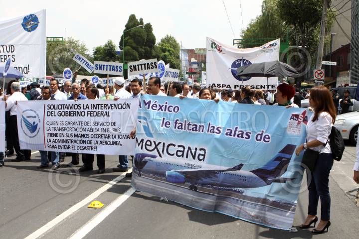 MÉXICO, D.F., 06JULIO2011.- Fernando Perfecto, lider de la Asociación Sindical de Pilotos de Aviación (ASPA); Lizzet Clavel, lider de la Asociación Sindical de Sobrecargos de Aviación (ASSA); Miguel Ángel Yúdico Colín, lider del Sindicato Nacional de Trabajadores de Transformación, Transporte y Aviación (SNTTTASS) durante una protesta de Trabajadores de Mexicana de Aviación que realizaron a las afueras de la Secretaria de Comunicaciones y Transportes para exigir el regreso de Mexicana y la reubicación de sus puestos de trabajo. FOTO: RODOLFO ANGULO/CUARTOSCURO.COM