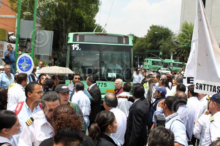 MÉXICO, D.F., 06JULIO2011.- Fernando Perfecto, lider de la Asociación Sindical de Pilotos de Aviación (ASPA); Lizzet Clavel, lider de la Asociación Sindical de Sobrecargos de Aviación (ASSA); Miguel Ángel Yúdico Colín, lider del Sindicato Nacional de Trabajadores de Transformación, Transporte y Aviación (SNTTTASS) durante una protesta de Trabajadores de Mexicana de Aviación que realizaron a las afueras de la Secretaria de Comunicaciones y Transportes para exigir el regreso de Mexicana y la reubicación de sus puestos de trabajo. FOTO: RODOLFO ANGULO/CUARTOSCURO.COM