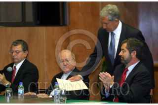 México, D.F. 27 SEPTIEMBRE 2004.- El perredista Manuel Camacho Solis, monseñor Abelardo Alvarado, Arturo Montiel, gobernador del Estado de México, y Juan Ramón de la Fuente, rector de la UNAM, durante el Foro Gobernabilidad, democracia, ¿Que Reforma?. FOTO: Sandra Perdomo/CUARTOSCURO.COM