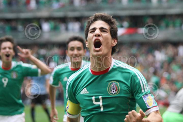 MÉXICO, D.F., 10JULIO2011.- Con gol de Antonio Briseño, el equipo mexicano esta doblegando a su similar de Uruguay, en el partido de la final de fútbol Copa del Mundo Sub 17, en el Estadio Azteca. FOTO: MOISÉS PABLO/CUARTOSCURO.COM
