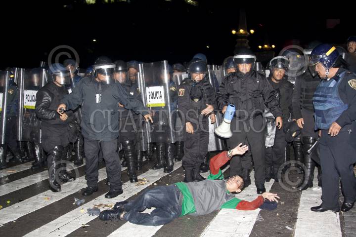 MÉXICO, D.F., 10JULIO2011.- Granaderos desalojaron a golpes y empujones a los aficionados que se dieron cita en el Ángel de la Independencia para celebrar el triunfo de la selección mexicana de futbol Sub 17 quienes obtuvieron la Copa Mundial al vencer a su similar de Uruguay dos goles a cero en el Estadio Azteca. FOTO: GUILLERMO PEREA /CUARTOSCURO.COM