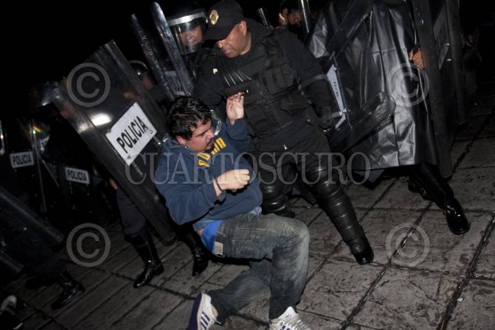 MÉXICO, D.F., 10JULIO2011.- Granaderos desalojaron a golpes y empujones a los aficionados que se dieron cita en el Ángel de la Independencia para celebrar el triunfo de la selección mexicana de futbol Sub 17 quienes obtuvieron la Copa Mundial al vencer a su similar de Uruguay dos goles a cero en el Estadio Azteca. FOTO: GUILLERMO PEREA /CUARTOSCURO.COM