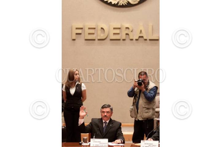 MÉXICO, D.F., 11JULIO2011.- Los representantes legislativos del PRI, Sebastián Lerdo de Tejada, y del PRD, Pablo Gómez, en la sesión general del IFE. FOTO: MOISÉS PABLO/CUARTOSCURO.COM