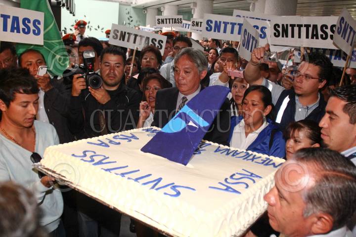 MÉXICO, D.F.,12JULIO2011.- En el marco del 90 aniversario de Mexicana de Aviación, pilotos y sobrecargos de la aerolínea realizaron una manifestación en el interior de la terminal uno donde un sacerdote les dio la bendición. Los dirigentes Miguel Ángel Yúdico, Fernando Perfecto, y Lizette Clavel, partieron un pastel en los mostradores la compañía aérea. FOTO: SAÚL LÓPEZ/CUARTOSCURO.COM
