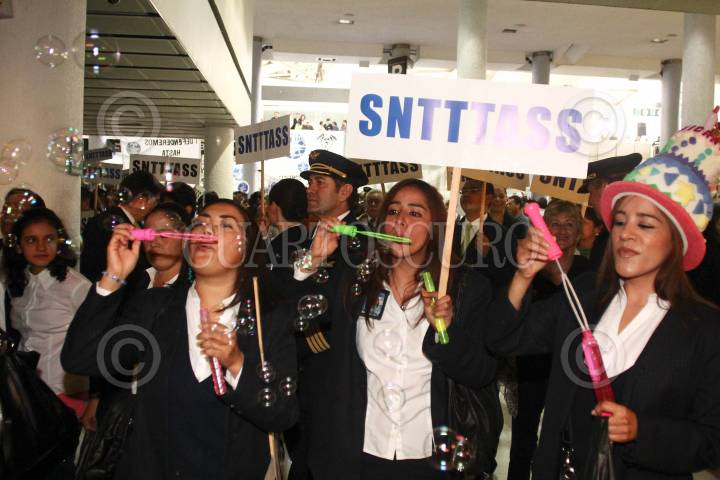 MÉXICO, D.F.,12JULIO2011.- En el marco del 90 aniversario de Mexicana de Aviación, pilotos y sobrecargos de la aerolínea realizaron una manifestación en el interior de la terminal uno donde un sacerdote les dio la bendición. Los dirigentes Miguel Ángel Yúdico, Fernando Perfecto, y Lizette Clavel, partieron un pastel en los mostradores la compañía aérea. FOTO: SAÚL LÓPEZ/CUARTOSCURO.COM