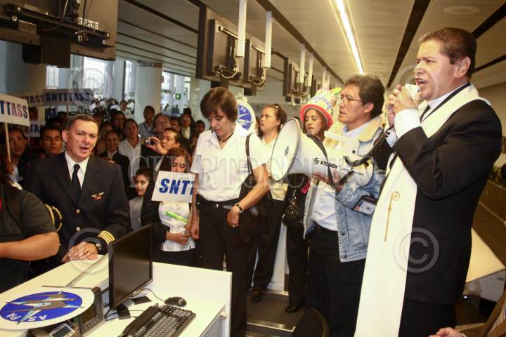 MÉXICO, D.F.,12JULIO2011.- En el marco del 90 aniversario de Mexicana de Aviación, pilotos y sobrecargos de la aerolínea realizaron una manifestación en el interior de la terminal uno donde un sacerdote les dio la bendición. Los dirigentes Miguel Ángel Yúdico, Fernando Perfecto, y Lizette Clavel, partieron un pastel en los mostradores la compañía aérea. FOTO: SAÚL LÓPEZ/CUARTOSCURO.COM