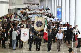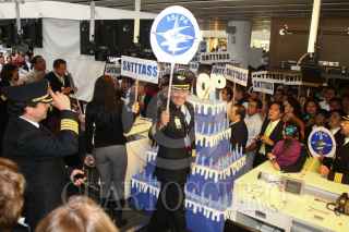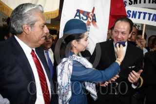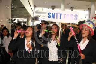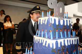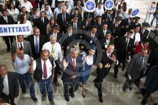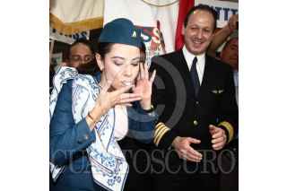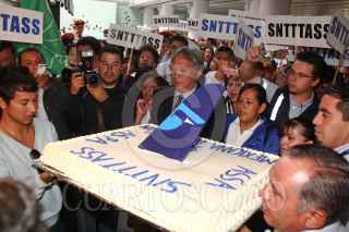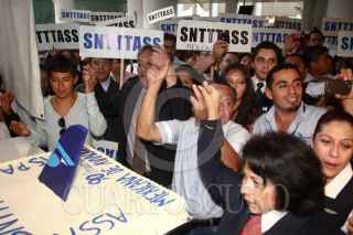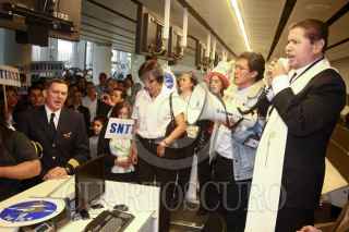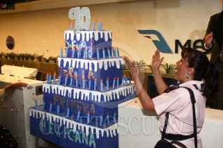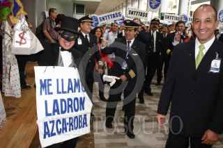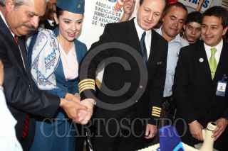 MÉXICO, D.F.,12JULIO2011.- En el marco del 90 aniversario de Mexicana de Aviación, pilotos y sobrecargos de la aerolínea realizaron una manifestación en el interior de la terminal uno donde un sacerdote les dio la bendición. Los dirigentes Miguel Ángel Yúdico, Fernando Perfecto, y Lizette Clavel, partieron un pastel en los mostradores la compañía aérea. FOTO: SAÚL LÓPEZ/CUARTOSCURO.COM