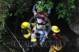 PUEBLA, PUEBLA, 12JULIO2011.- Tres adolecentes de entre 16 y 17 años, dos hombres y una mujer, quedaron atrapados en una caverna al aumentar la corriente de agua del río Atoyac provocado por las precipitaciones plúviales. Elementos de Protección Civil y el cuerpo de bomberos realizaron las labores de rescate en la que los menores resultaron ilesos. FOTO: FRANCISCO GUASCO/CUARTOSCURO.COM
