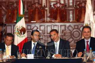 PUEBLA, PUEBLA, 14JULIO2011.- Enrique Agüera Ibañez, rector de la BUAP, Javier Lozano Alarcón, titular de la STPS federal, Rafael Moreno Valle, gobernador de Puebla, y Pablo Rodríguez Regordosa, secretario del trabajo estatal, encabezaron la reunión con lo sectores productivos, en el que empresarios y sindicalizados, intercambiaron opiniones sobre el ámbito laboral en Puebla. FOTO: FRANCISCO GUASCO/CUARTOSCURO.COM