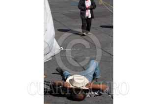 MÉXICO, D.F., 20JULIO2011.- La desocupación en personas de edad productiva es uno de los grandes males de la ciudades. La imagen corresponde a un integrante del Frente Popular Francisco Villa acostado en la plancha del Zócalo. FOTOS: MOISÉS PABLO/CUARTOSCURO.COM